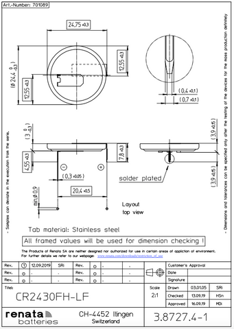 Renata CR2430FH-LF Battery (2 Pin Horizontal)(25 Pieces)