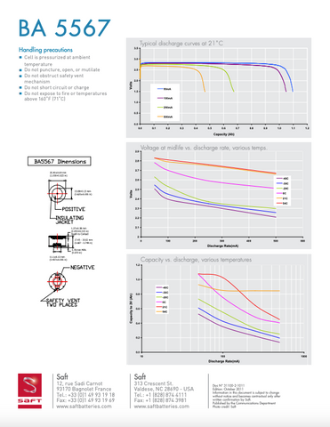 Low self-discharge rate (less than 3% after one year of storage at + 20˚C),Hermetic glass-to-metal sealing, Flat pressure contact terminals, Built-in safety vent (at the negative end of the cell), UL Component Recognition (File number MH 15076), Meets shock, vibration, and other environmental requirements of military specifications, Made in the USA