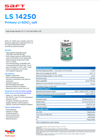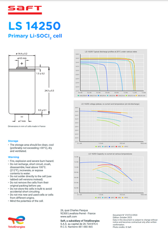 Saft LS14250 Battery - 3.6V 1/2AA Lithium