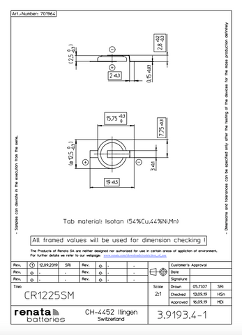 Renata CR1225SM Battery (Surface Mount Solder Tabs)(100 Pieces)