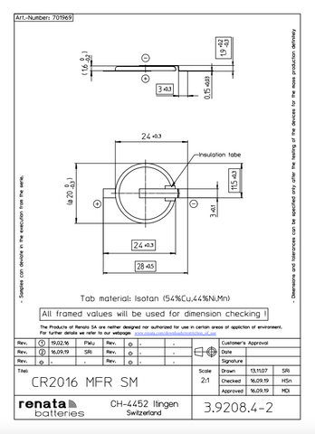Renata CR2016 MFR SM Batteries (Surface Mount Solder Tabs)(25 Pieces)